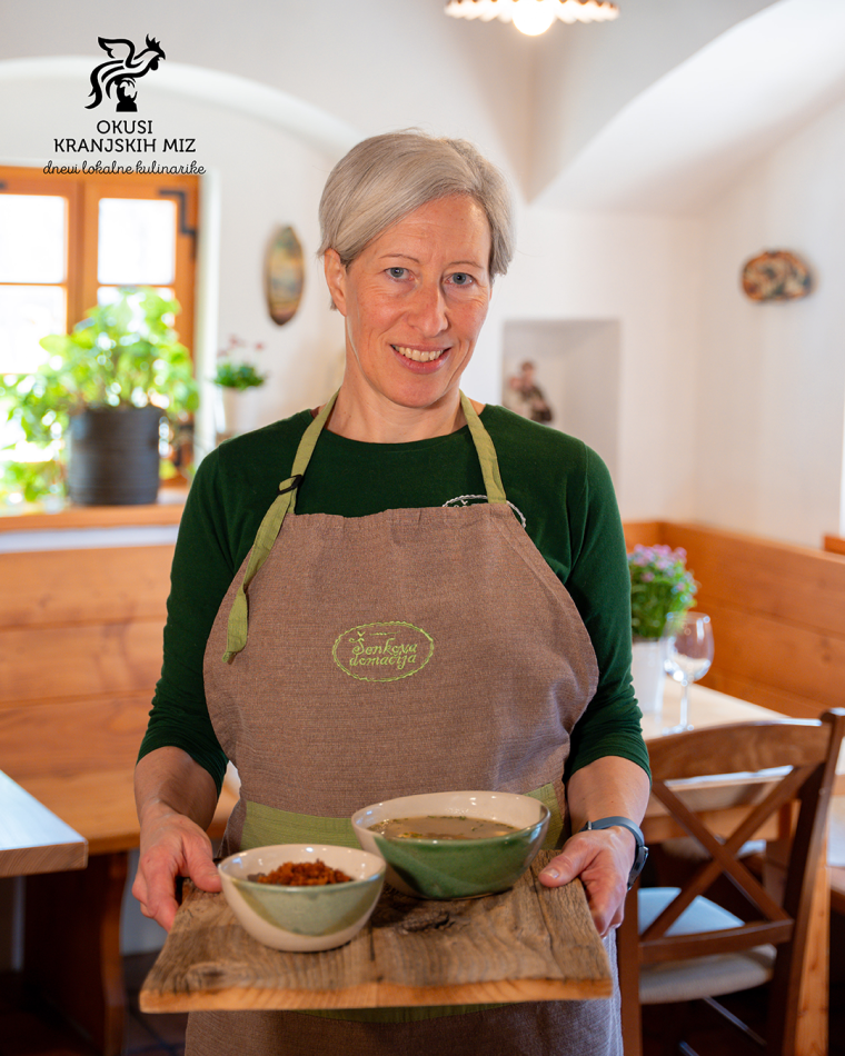 → Lokalne sestavine: mleko in skuta z ekološke kmetije Pr’ Vernk (Zgornje Jezersko), ajdova in bela moka iz mlina Pr’ Maršet (Vodice), ržena in pirina moka z Ankove kmetije (Zgornje Jezersko), med čebelarke Marije Arh Štular (Zgornje Jezersko) ter številne odlične sestavine (zelenjava, začimbe, telečje meso pasme cika, ocvirki krškopoljskih prašičev) s Šenkove domačije.